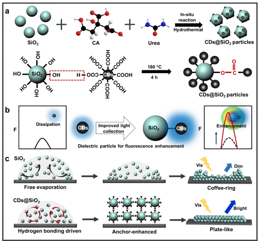 图1 (a) 原位水热策略合成CDs@SiO2粒子的示意图;(b) CDs@SiO2粒子的荧光增强机制;(c) 普通SiO2粒子与CDs@SiO2粒子的组装机理示意图