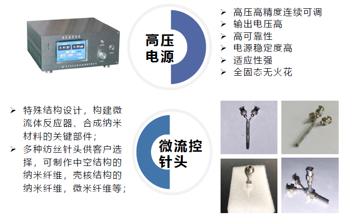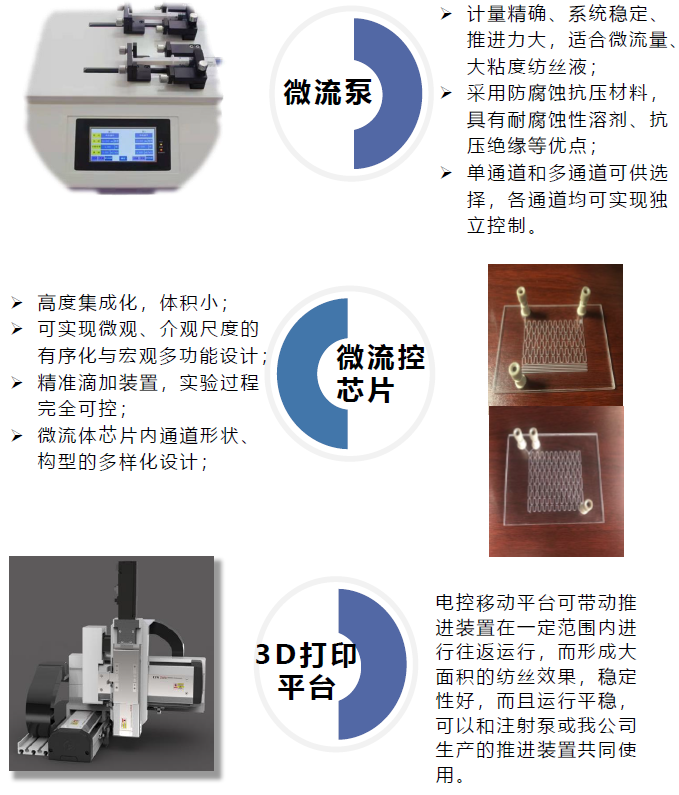 微流体静电3D打印纺丝机融合静电纺丝、微流体纺丝以及3D打印的原理,以多样化微流控芯片为核心,通过微流控数字化精准调控,既可以实现微流体制备有序纤维的要求,实现多层次结构,又可以实现常规静电纺丝机制备超细化纤维的功能,同时,可折叠的机械臂也可实现3D打印,从而可以实现一机多用的目的,满足不同研究领域的需求。