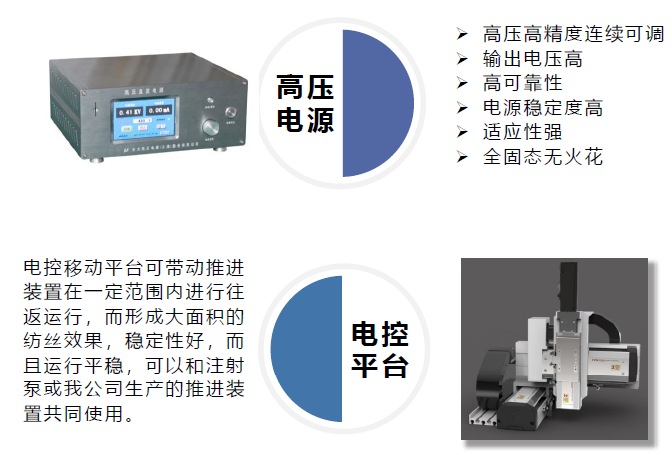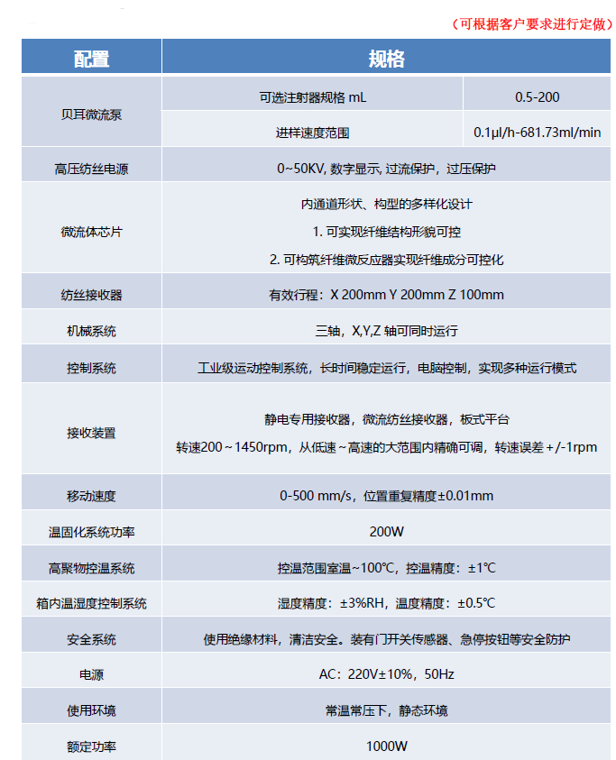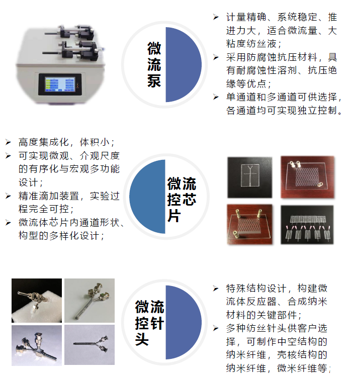 微流体静电纺丝机融合静电纺丝、微流体纺丝的原理,以多样化微流控芯片为核心,通过微流控数字化精准调控,全新设计出静电微流控一体纺丝机,既具有静电可制备超细纤维的特点,又具有微流控可制备高度有序的纤维的特点,通过微流控数字化经精准调控,实现多层次结构,多组成杂化纤维,又可以实现常规静电纺丝机制备超细化纤维的功能,从而可以实现一机多用的目的并且可以通过微流控芯片实现原位纺丝化学合成,使其纺丝过程同时具备物理和化学过程的特点。