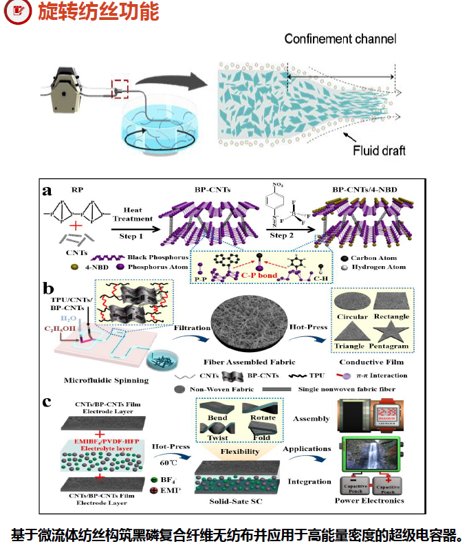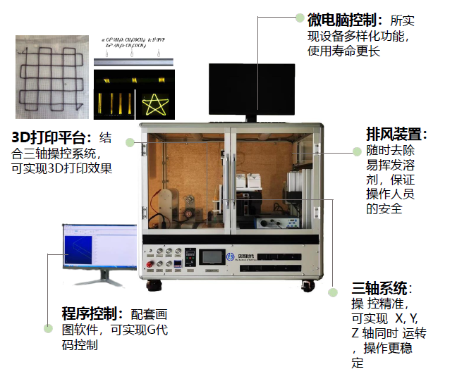 微流体旋转静电纺丝涂膜3D打印纺丝机融合静电纺丝、 微流体纺丝、静电涂膜,3D打印、旋转纺丝的原理,以多样化微流控芯 片为核心,通过微流控数字化精准调控,既可以实现微流 体制备有序纤维的要求,实现多层次结构,又可以实现常 规静电纺丝机制备超细化纤维的功能,同时,可折叠的机 械臂也可实现3D打印,从而可以实现一机多用的目的, 满 足不同研究领域的需求。