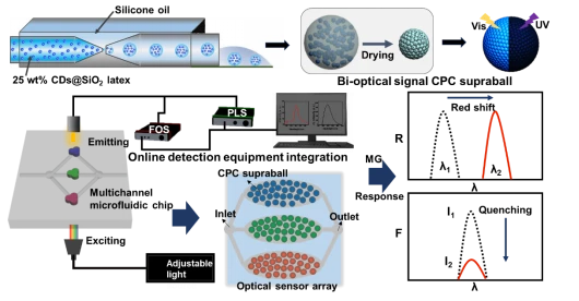 图3 采用液滴微流控技术构筑双光学信号CDs@SiO2胶体光子晶体微球的示意图,及其在用于兽药浓度检测的微流控芯片开发中的应用