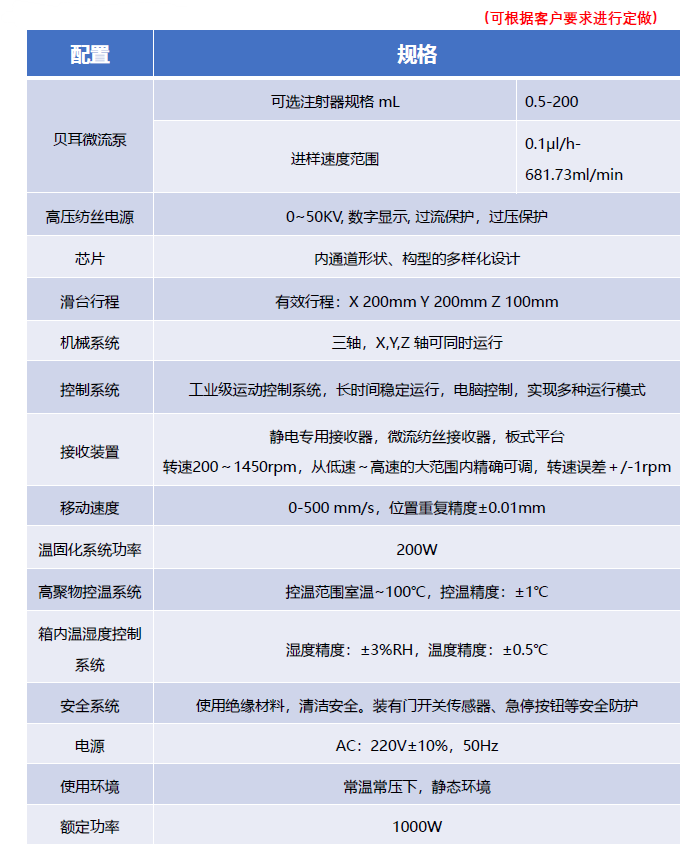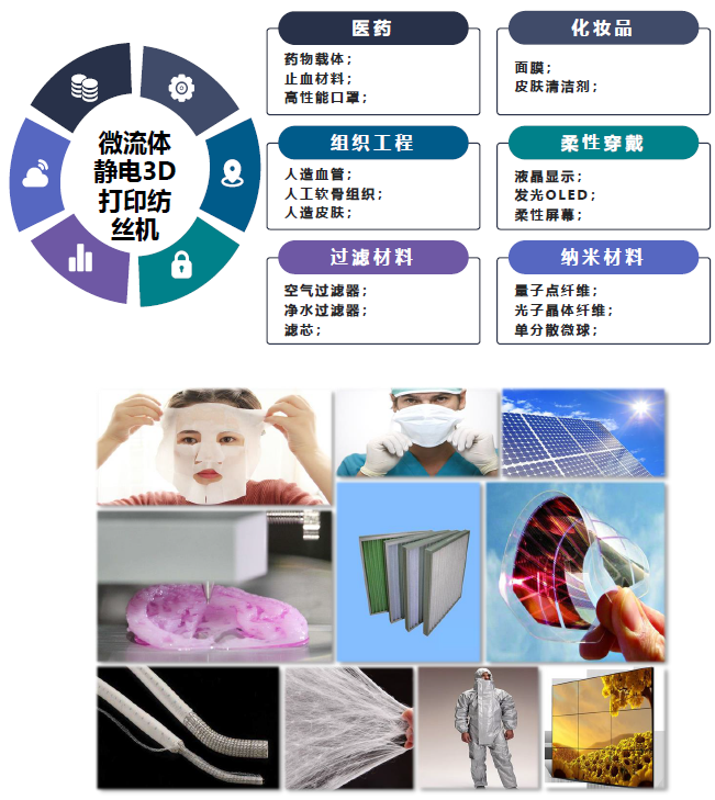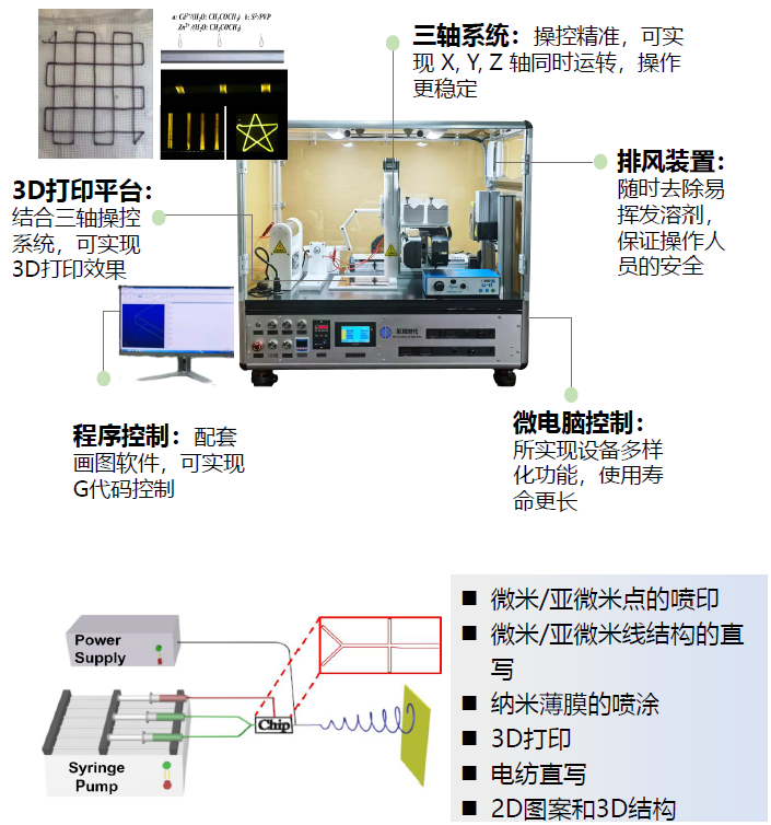 微流体静电3D打印纺丝机融合静电纺丝、微流体纺丝以及3D打印的原理,以多样化微流控芯片为核心,通过微流控数字化精准调控,既可以实现微流体制备有序纤维的要求,实现多层次结构,又可以实现常规静电纺丝机制备超细化纤维的功能,同时,可折叠的机械臂也可实现3D打印,从而可以实现一机多用的目的,满足不同研究领域的需求。