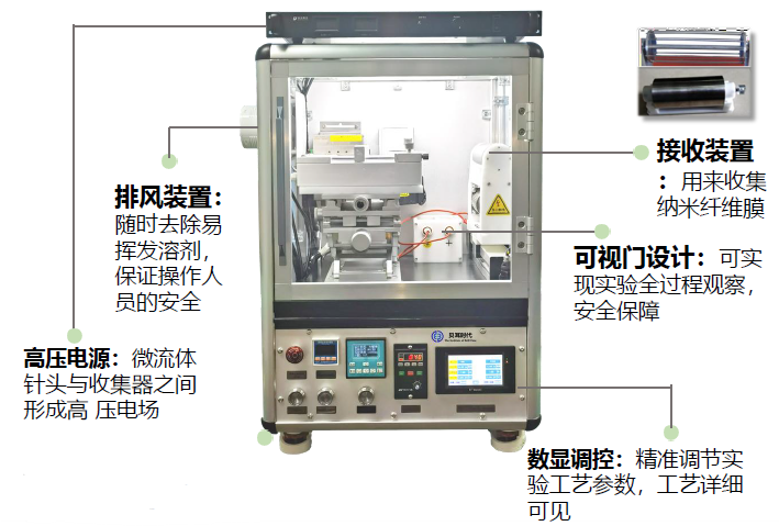 微流体静电纺丝机融合静电纺丝、微流体纺丝的原理,以多样化微流控芯片为核心,通过微流控数字化精准调控,全新设计出静电微流控一体纺丝机,既具有静电可制备超细纤维的特点,又具有微流控可制备高度有序的纤维的特点,通过微流控数字化经精准调控,实现多层次结构,多组成杂化纤维,又可以实现常规静电纺丝机制备超细化纤维的功能,从而可以实现一机多用的目的并且可以通过微流控芯片实现原位纺丝化学合成,使其纺丝过程同时具备物理和化学过程的特点。