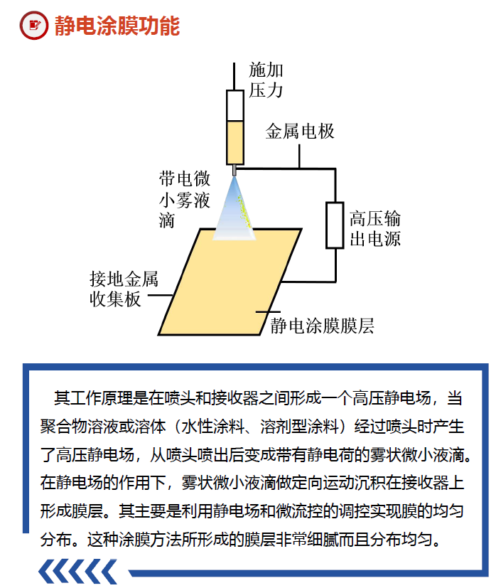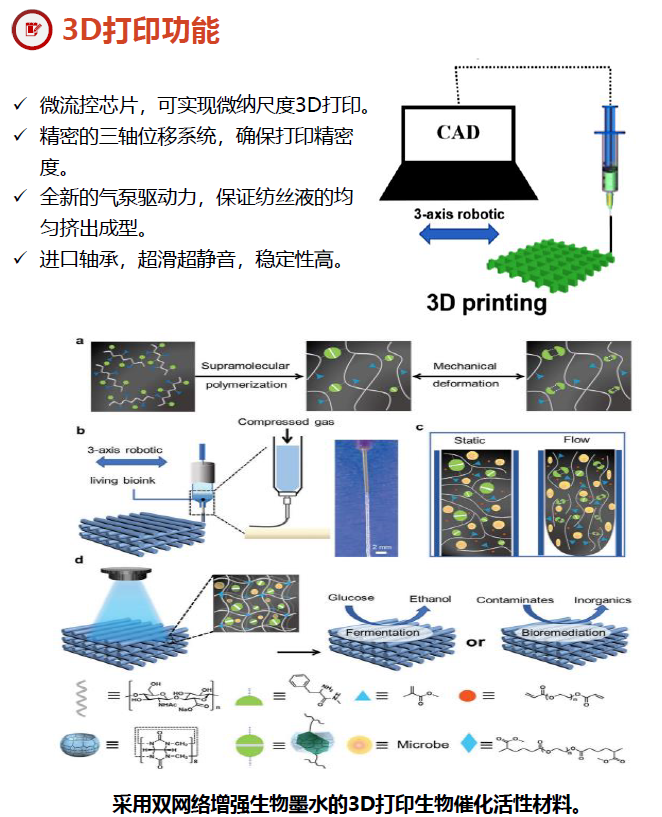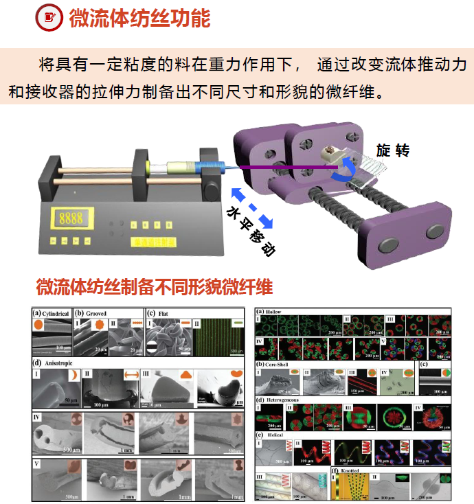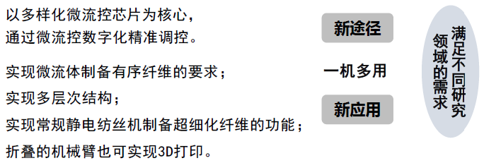 微流体旋转静电纺丝涂膜3D打印纺丝机融合静电纺丝、 微流体纺丝、静电涂膜,3D打印、旋转纺丝的原理,以多样化微流控芯 片为核心,通过微流控数字化精准调控,既可以实现微流 体制备有序纤维的要求,实现多层次结构,又可以实现常 规静电纺丝机制备超细化纤维的功能,同时,可折叠的机 械臂也可实现3D打印,从而可以实现一机多用的目的, 满 足不同研究领域的需求。