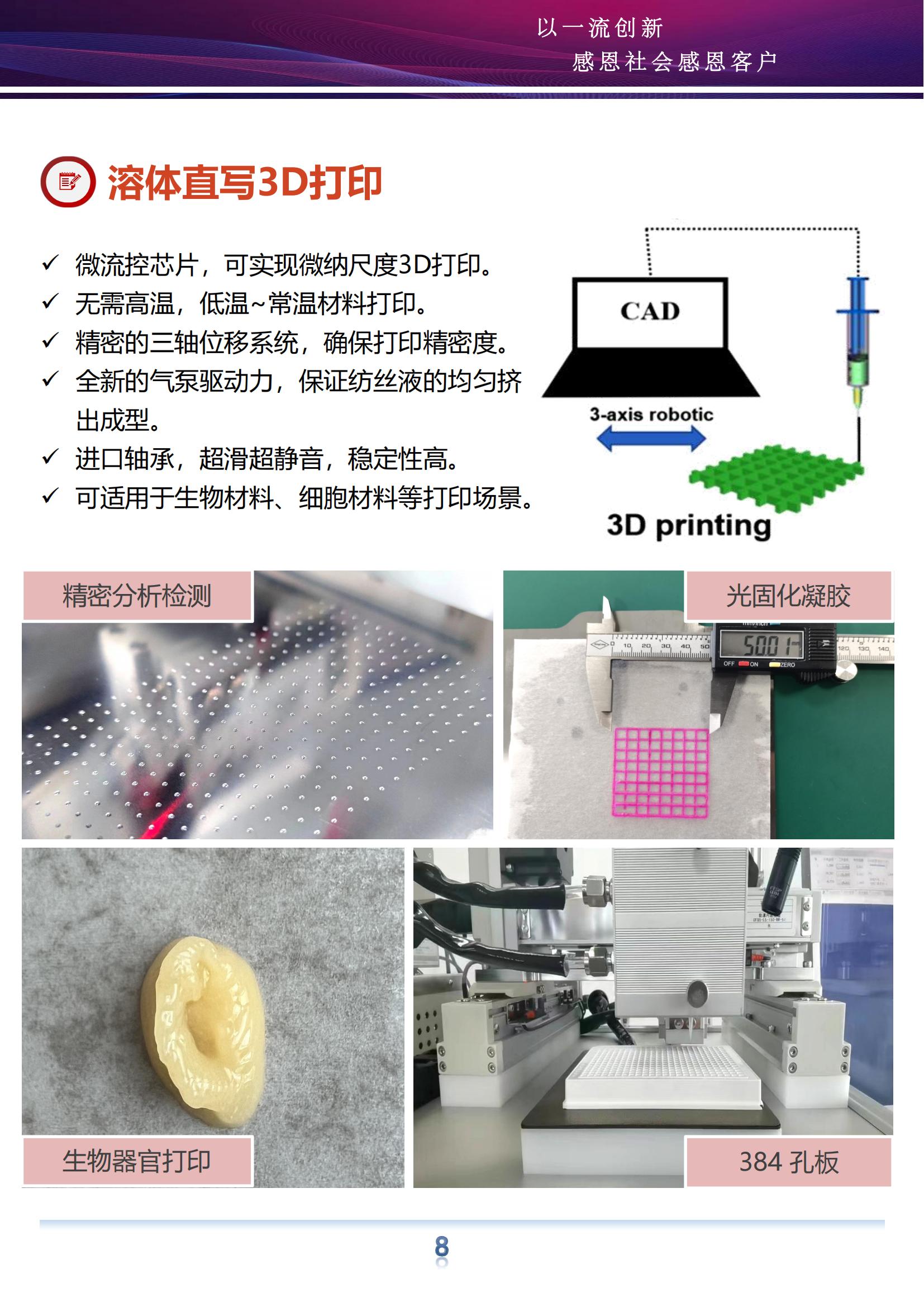 自主研发的微流体多功能直写3D打印纺丝机,通过配套专用的挤压系统,能够大幅度提升打印效率。同时可突破传统线材打印对材料的限制,适用范围更为广泛,能满足多个领域的要求。